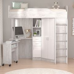 В комплект входит: кровать, внизу которой расположены вместительный угловой шкаф (полки и штанга), стеллаж для книг и компьютерный стол с дополнительным столиком.