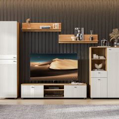 Модульная гостиная «Милан» Белая — это невероятное сочетание ЛДСП в цвете Дуб Золотой и Белого матового МДФ. Безупречная фрезеровка фасадов подчёркивает мягкую матовую текстуру, а сама гостиная выглядит ярко и контрастно. Всё это позволяет сделать дизайн гостиной уникальным и запоминающимся.