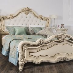 Кровать Мона Лиза крем с мягким изголовьем воплощение классики, большая и респектабельная она станет украшением любой спальни. Кровать имеет высокую спинку и низкое изножье, декоративные элементы выполнены не броско с ручным патинированием.